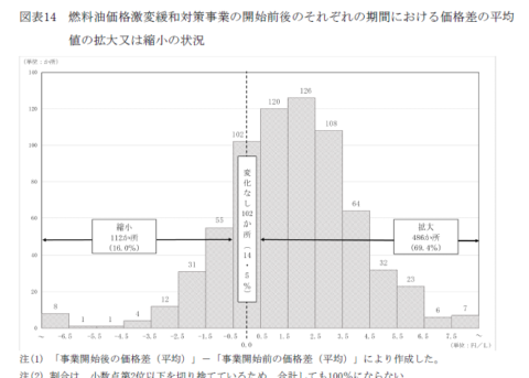 他方で、卸売価格の抑制が、小売価格に反映されないこともありえる。そこで、両者を比較することにした。図1は分析結果を示したものだが、700か所のガソリンスタンドのうち価格差が拡大していのが7割を占めていることが分かった。補助金が卸売価格の抑制に反映されても、小売価格にはなかなか反映されていない状況がみてとれる。