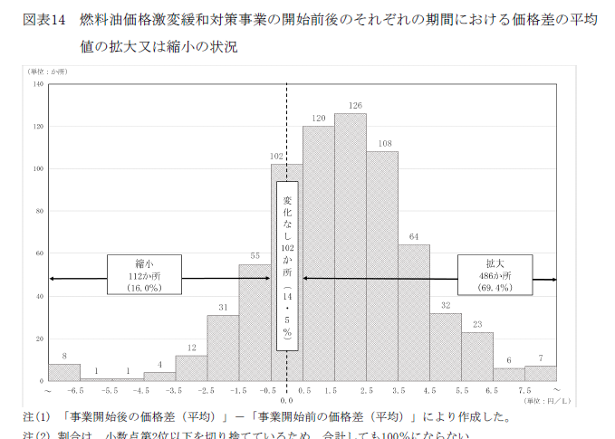 他方で、卸売価格の抑制が、小売価格に反映されないこともありえる。そこで、両者を比較することにした。図1は分析結果を示したものだが、700か所のガソリンスタンドのうち価格差が拡大していのが7割を占めていることが分かった。補助金が卸売価格の抑制に反映されても、小売価格にはなかなか反映されていない状況がみてとれる。